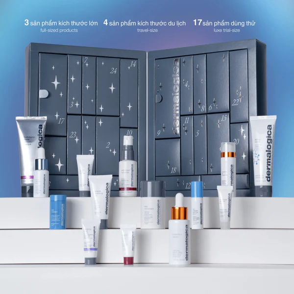 Bộ sản phẩm quà tặng không ngừng mang đến niềm vui. Chào đón mùa lễ hội với bộ 24 ngày bất ngờ Dermalogica, người bạn đồng hành hàng ngày của bạn để có làn da khỏe mạnh, rạng rỡ hơn. Bộ sản phẩm bao gồm 3 sản phẩm full-size, 4 sản phẩm kích cỡ du lịch và 17 sản phẩm dùng thử cao cấp.